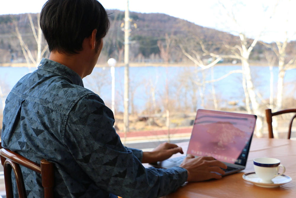 時には湖畔のベンチに腰掛けて、大自然を肌で感じながらお仕事も。リモートワークの疲れを癒してくれる天然の涼風。